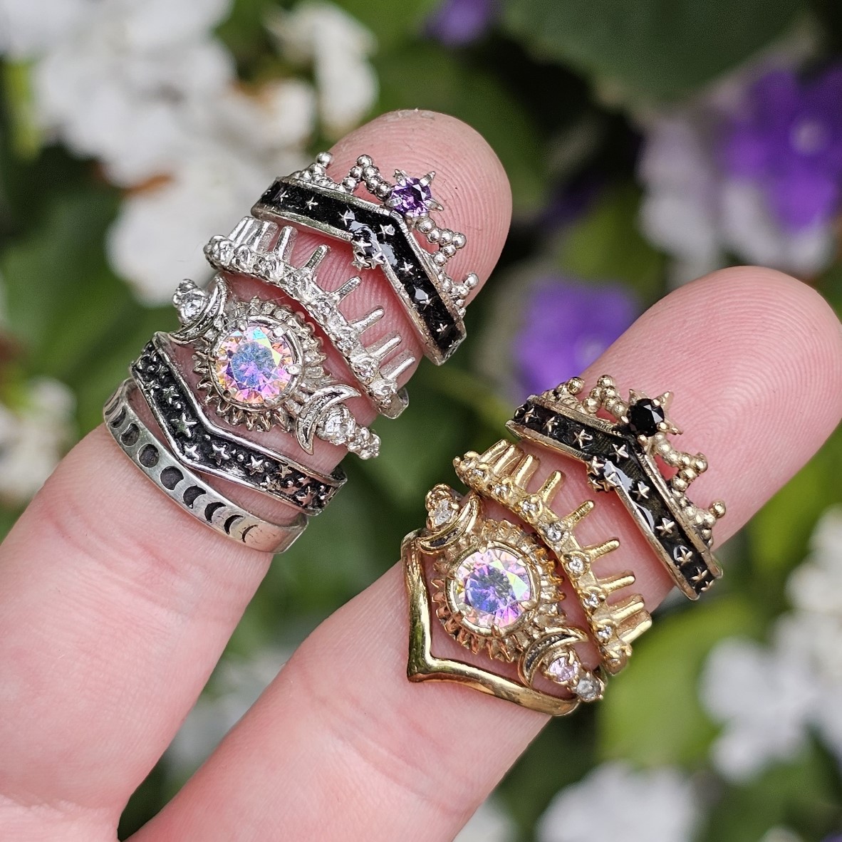 Precioso anillo estilo Corona de Princesa con estrellas y Zirconia Cúbica color a elección entre los disponibles. Version elaborada en Plata 925 maciza o baño en Oro 18k.