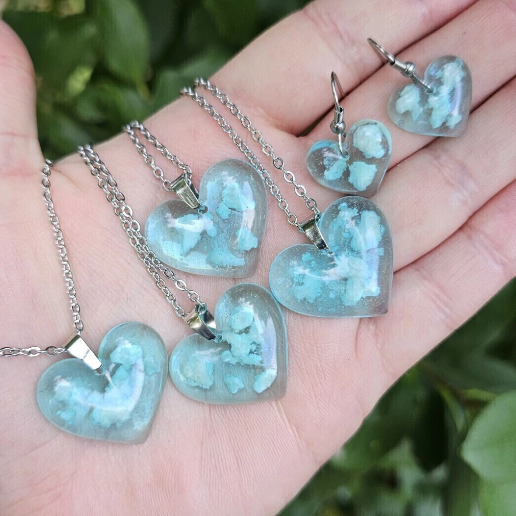 Aritos Cielo con Nubes Encapsuladas en forma de Corazón. Sus Nubes brillan en la oscuridad en Azul luego de cargarlos unos minutos en Luz. Elaborado en vidrío liquido/resina. Ideales para llevar a conjunto conn el collar cielo que también tenemos publicado.